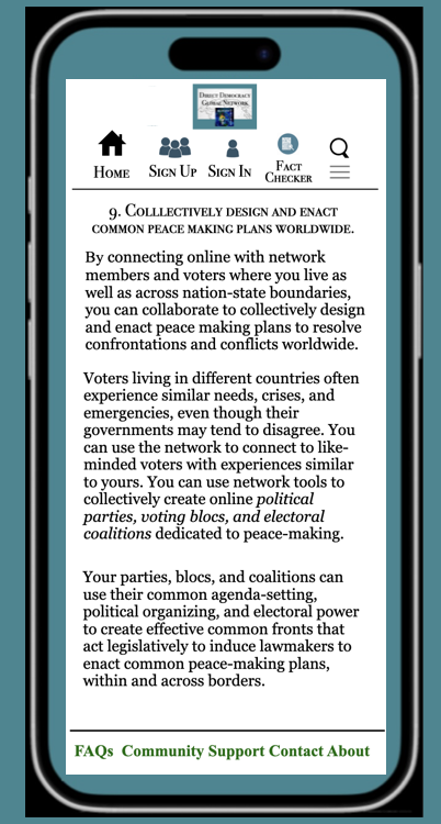 To summarize in closing, the network empowers voters to re-invent democracy by applying and adapting Swiss-inspired direct democracy tools to build consensus across partisan lines, within their home countries and cross-nationally. They can access the network free of charge and build large scale online voting blocs, political parties, and electoral coalitions with sufficient voting strength to defeat and replace unresponsive lawmakers.